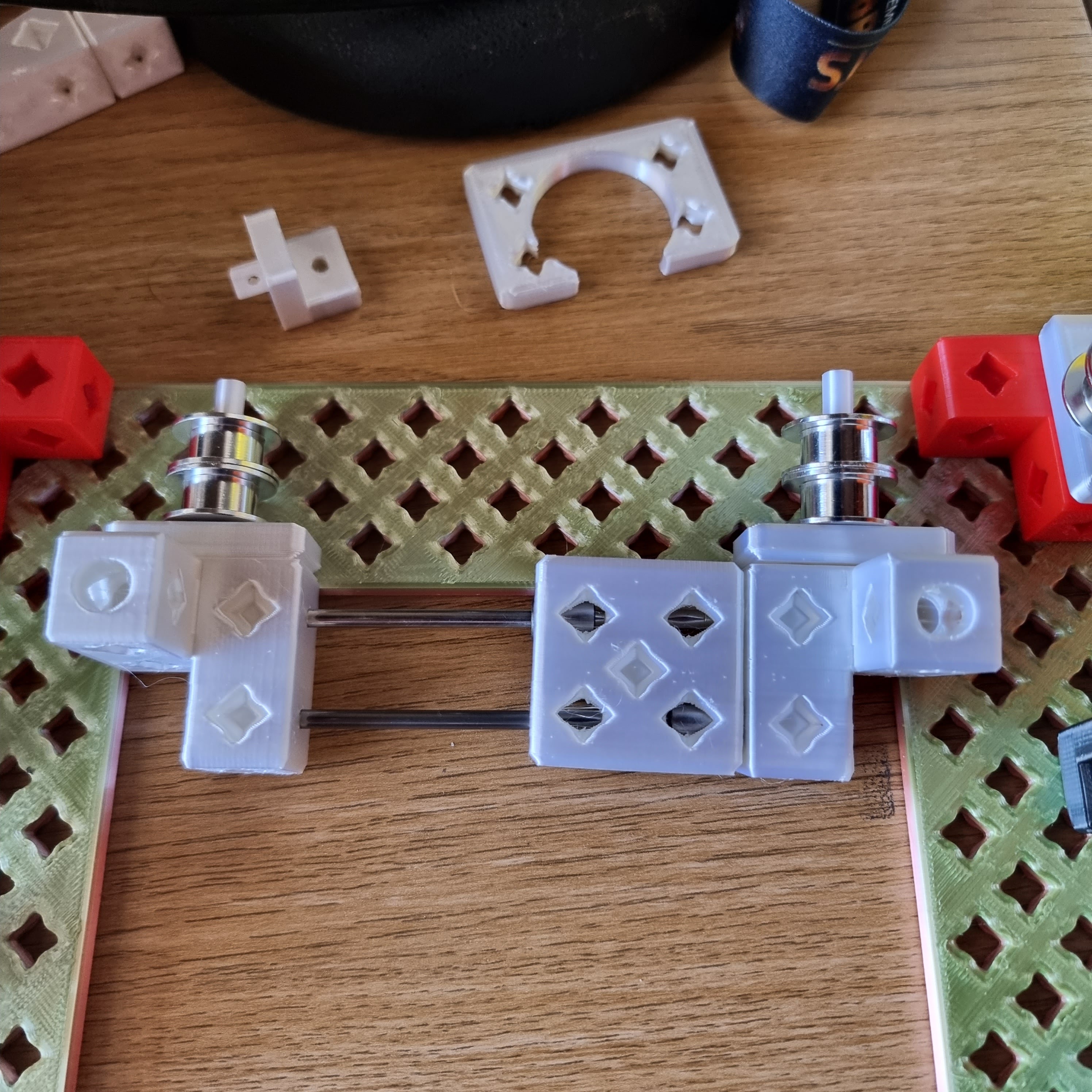 Augmented with nuts/bolts these Bed belt holder: 2x1 bloks with X carriage belt holder: a funny little arch bit to wrap and zip tie/clip the belt around, can’t get more simple than that. Z axis idler: this of cheese is ugly and annoyingly it works. Nothing else to say about it, we needed something that was wide enough for a single bearing and it did the trick. XY 2x2x2 idler: Inspired by my gigantablok base set, but with a hollowed out core, these hold the A/B idlers for the CoreXY motion opposite the motors. These where the 2nd blok I made for this little adventure, and they look super fancy. 2x1 idler: This was almost a hint of genius, I needed something compact that could sit on the Y carriage and hold idlers, and initially it was temporary while testing. I did have an instance where the shaft snapped off and so I put an M3 bolt in there as a fix, and really since then I’ve had no issues. And it goes to show the most permanant fixes are the temporary ones. Bonus points, you print them without the shaft and they hold the 3mm rods in the right place for the Y axis! 1x1 idler: it’s the same as the above. But used to hold the Z axis rods.